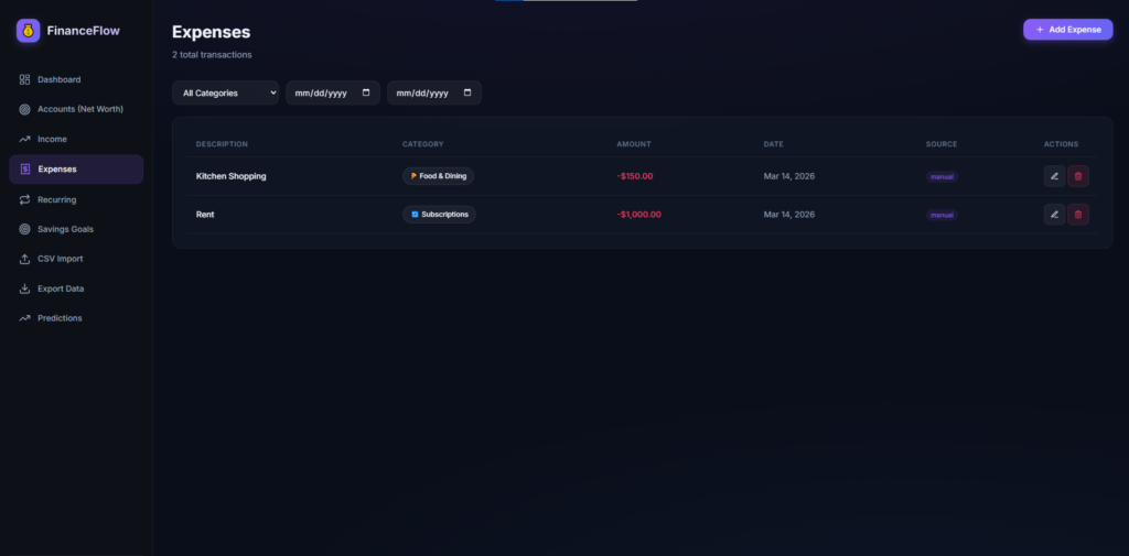 FinanceFlow is a full-stack web application developed to make personal finance management intelligent. It enables users to visualize their expenses, set savings goals, and manage their budgets through data-driven insights.